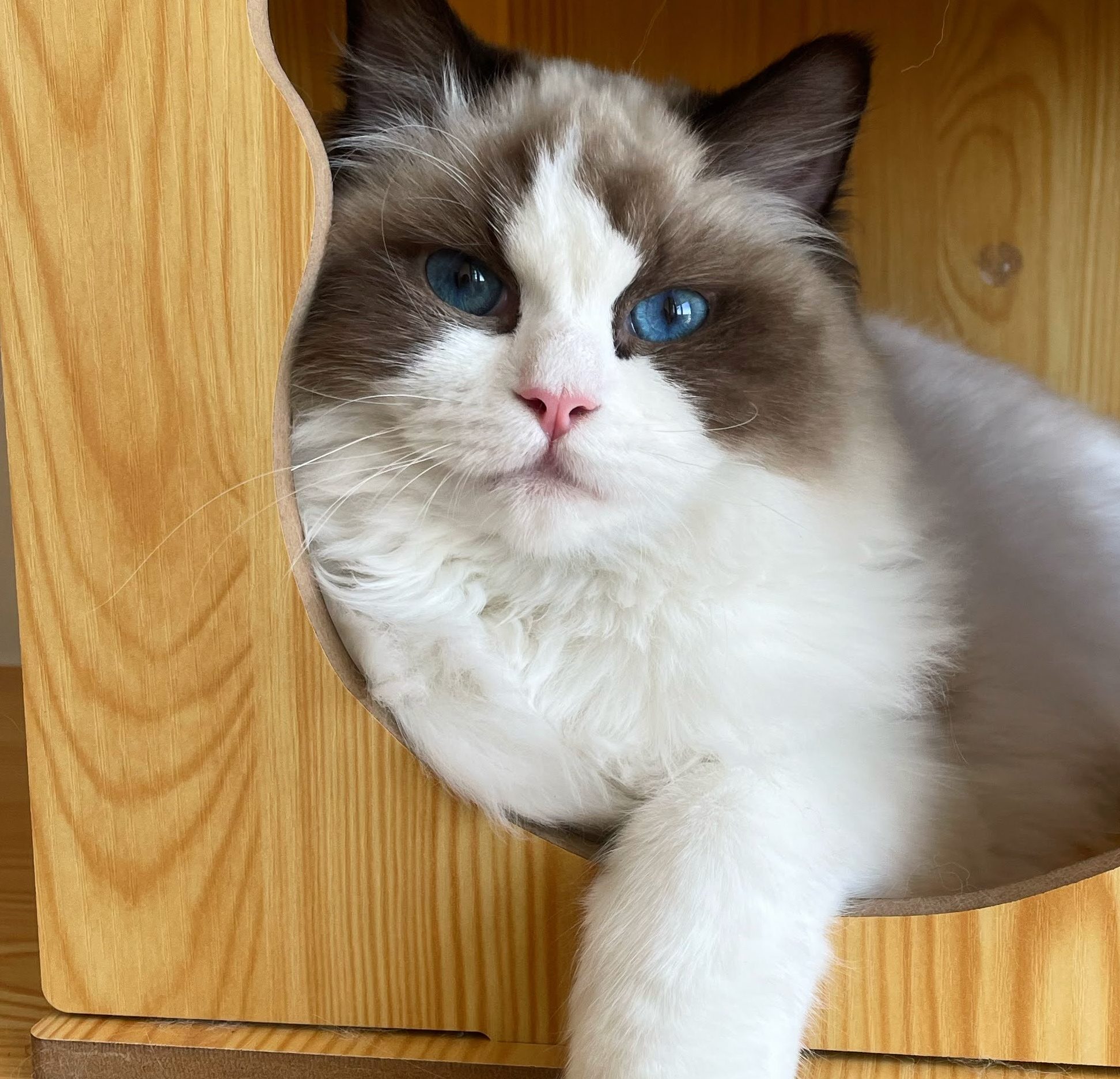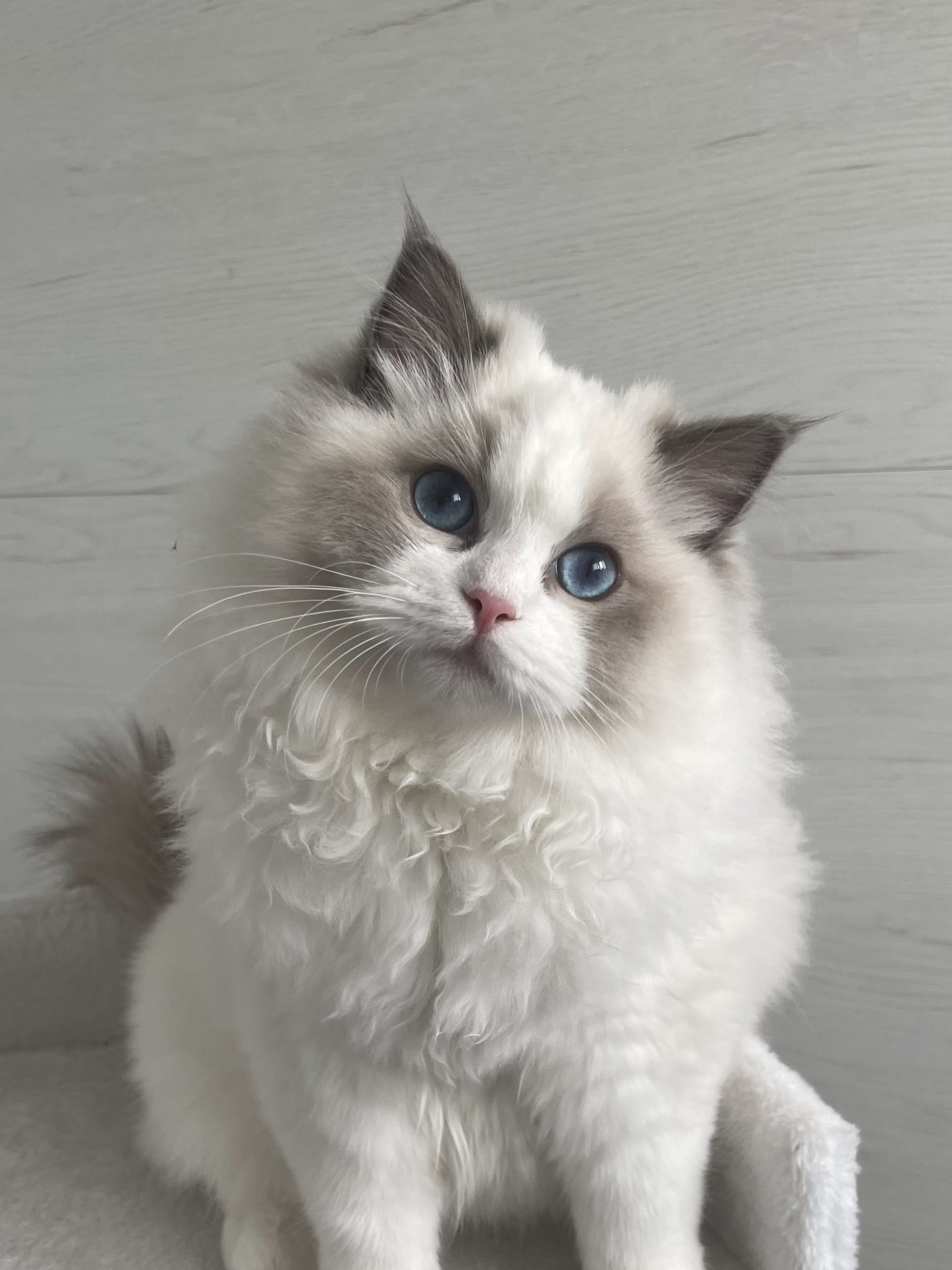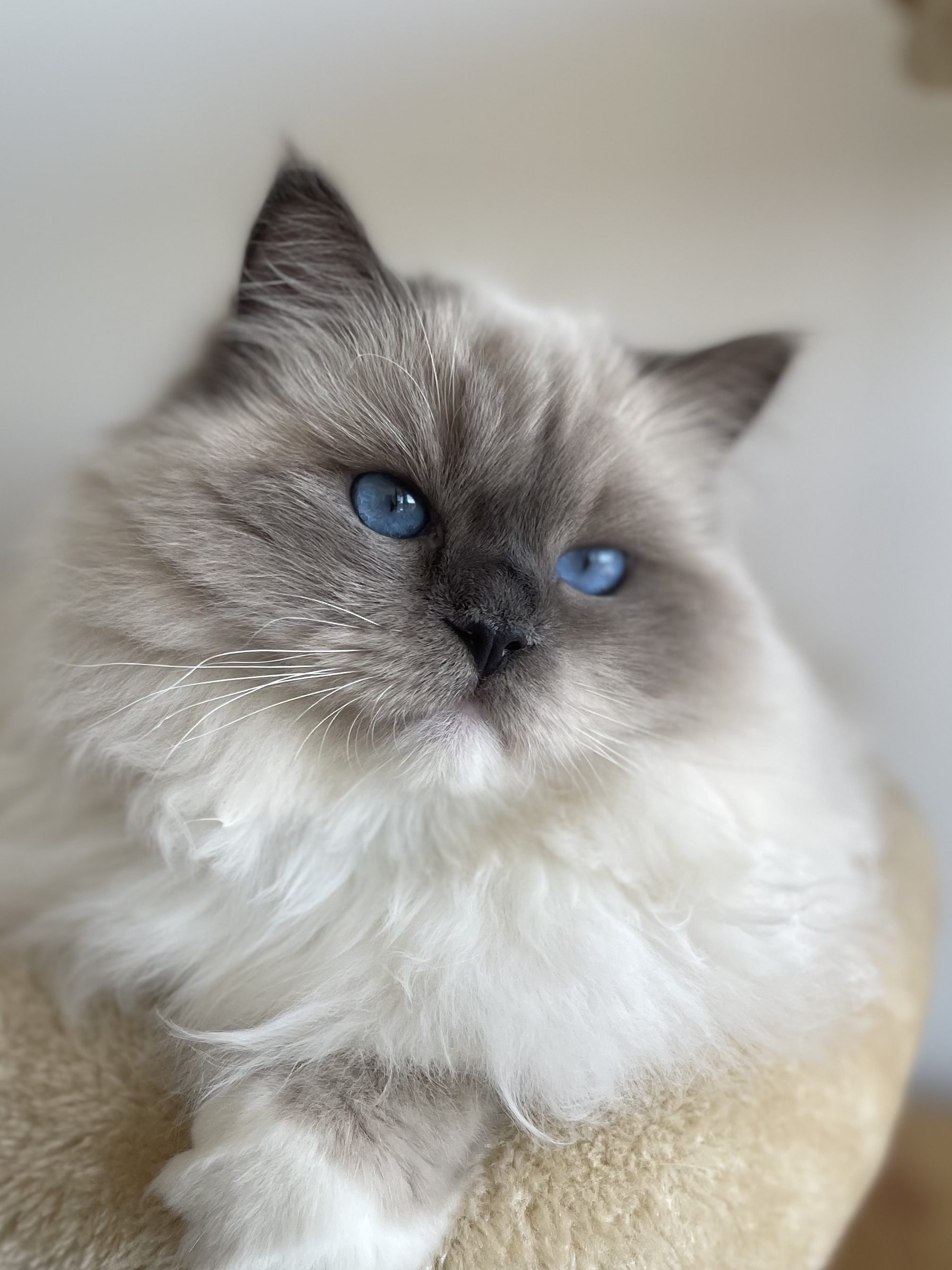 Nuestro proyecto de cría comenzó con ella. Mía es una ragdoll blue mitted super afectuosa y tranquila. No deja de ronronear y le encanta acurrucarse cerca de la familia. Ha heredado la personalidad juguetona de su madre y la elegancia y gran presencia de su padre Sky de Darlinlildols. Posee una estructura ósea fuerte, unas orejas perfectamente colocadas y esa dulce expresión de muñeca que tanto nos gusta.