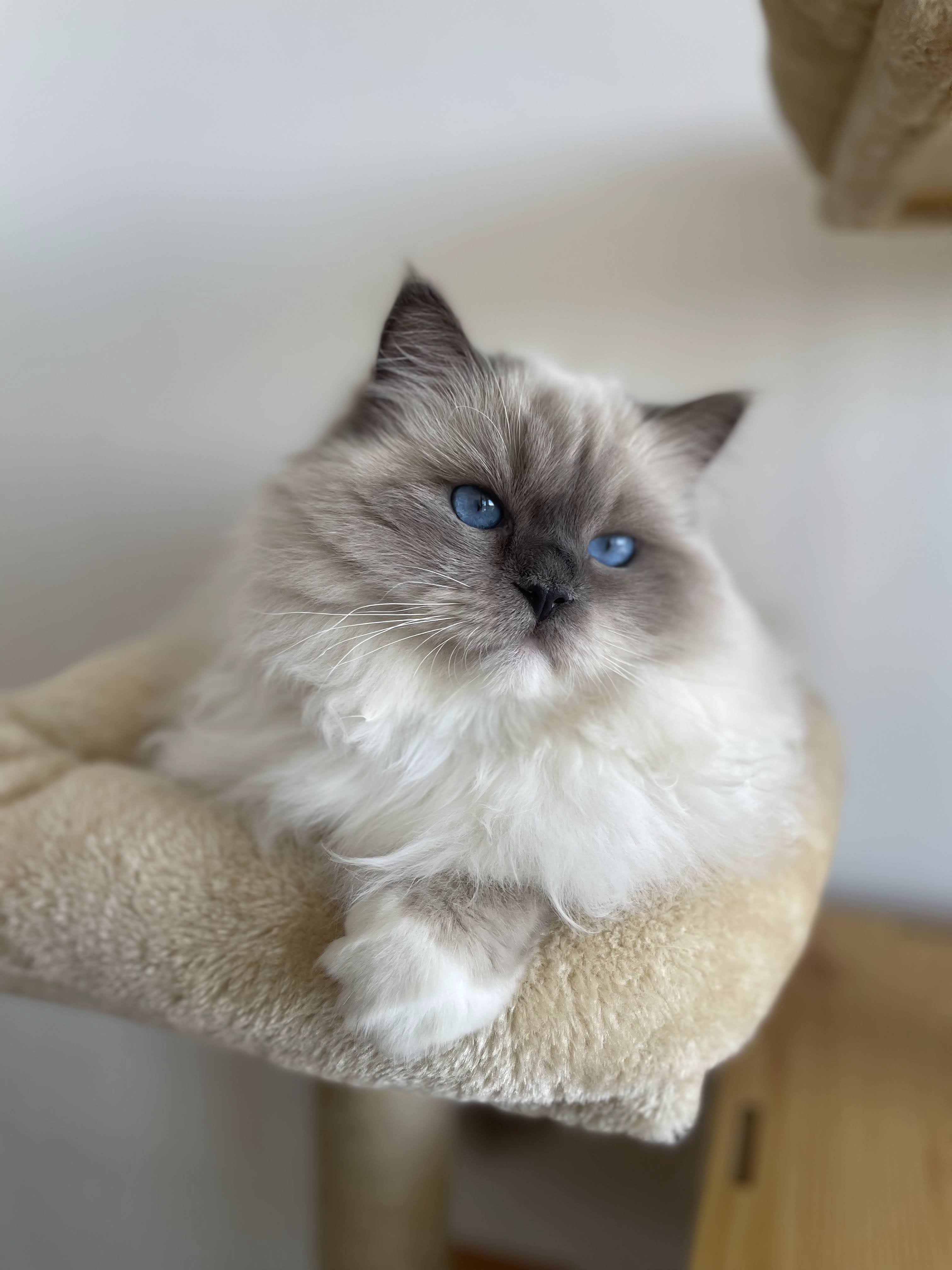 Él es el rey de la casa y el macho principal de nuestro plan de cría. Presume de una estructura y tamaño impresionantes, con un manto sedoso muy suave. Una cabeza y perfil equilibrados y como es caracteristico de la raza, unos preciosos ojos azules. Le encanta estar cerca de la familia, especialmente de los más pequeños y pide caricias y arrumacos con suaves empujones de cabeza y ronroneos. Un gran temperamento que junto a su imponente físico nos da unos gatitos ragdoll sanos, fuertes y fieles al estándar de la raza.